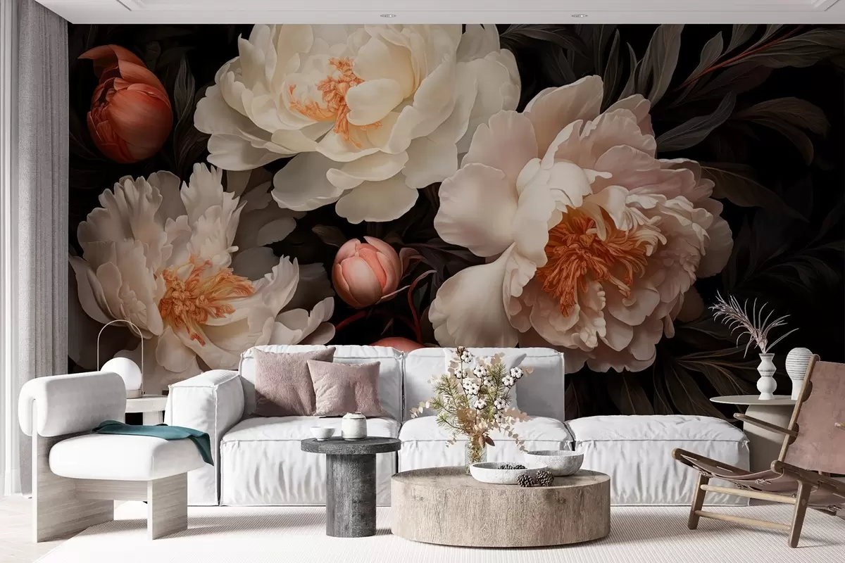 Fotobehang Witte grote pioenrozen met rode knoppen op een donkere achtergrond N° w08965