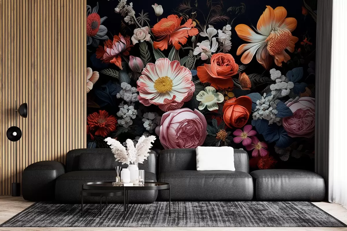 Fotobehang Kleurrijk boeket van verschillende bloemen op een donkere achtergrond in koele tinten N° w08969v1