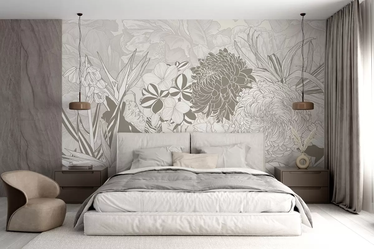 Fotobehang Bloemen en bladeren in beige tinten, inclusief chrysanten, plumeria en tropisch gebladerte, botanisch ontwerp N° w08976