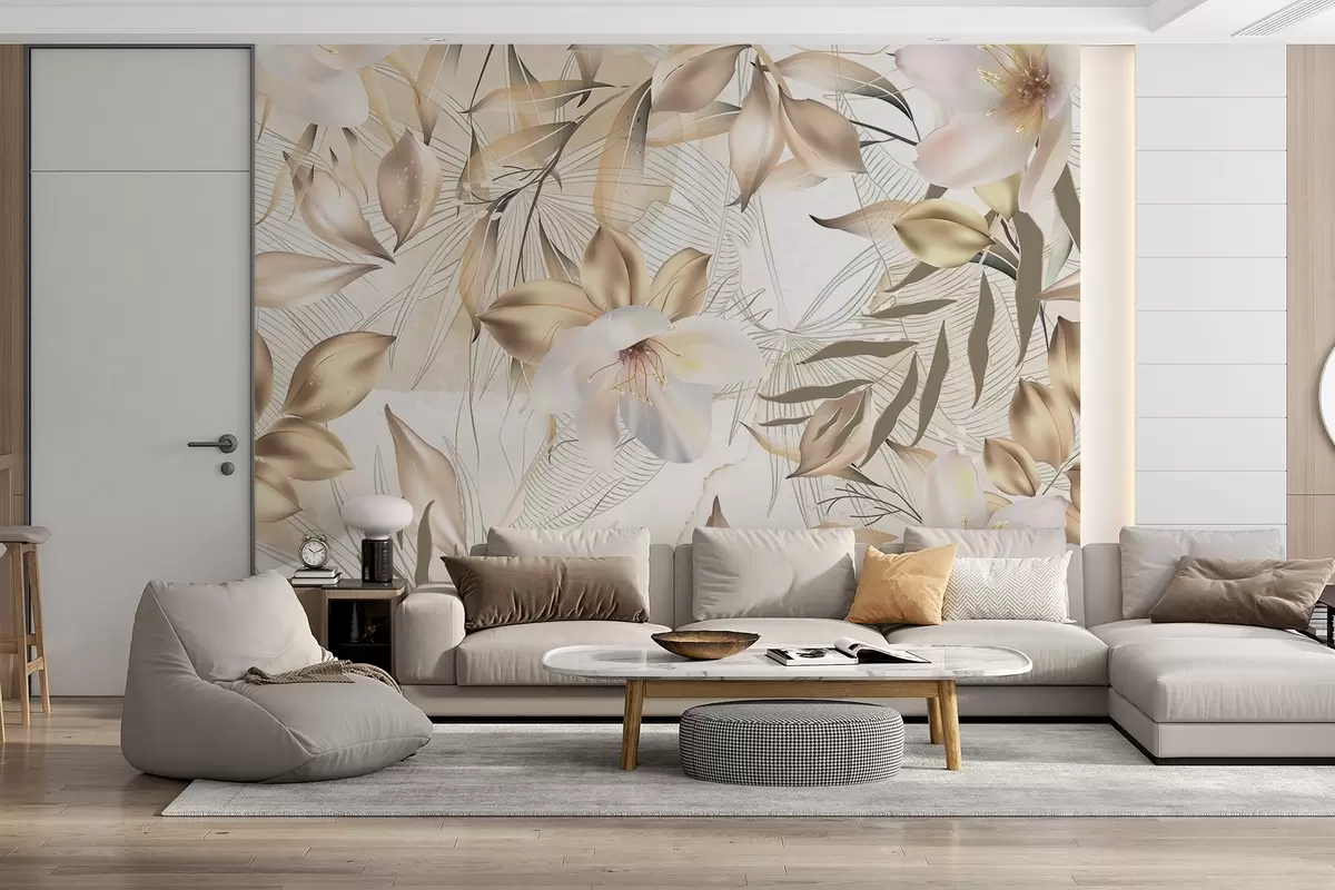 Fotobehang Jasmijn bloemen en bladeren, zachte kleuren, botanische illustratie, florale achtergrond, elegant ontwerp, delicate bloemblaadjes N° w08977