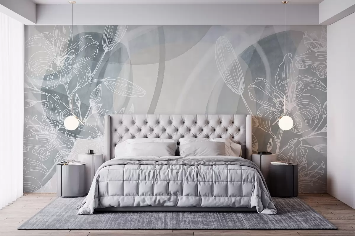 Fotobehang Minimalistisch bloemmotief met witte lijnkunstbloemen en bladeren, overlappende abstracte cirkels in grijstinten en blauw N° w08979