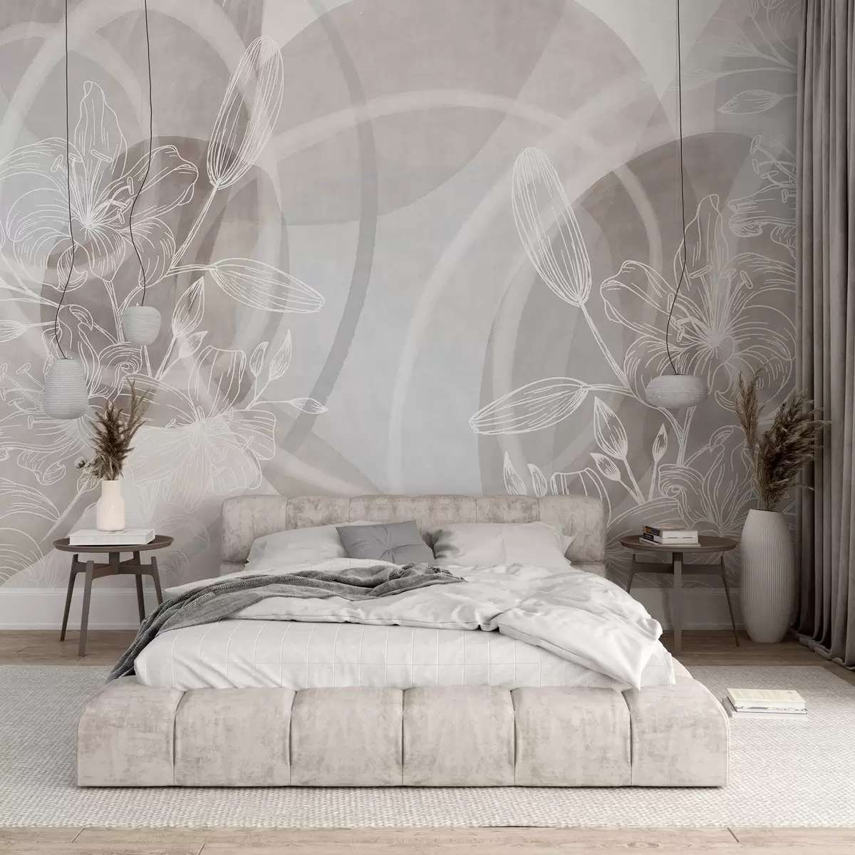 Fotobehang Minimalistisch bloemmotief met witte lijnkunstbloemen en bladeren, overlappende abstracte cirkels in beige en blauwe tinten N° w08979v1