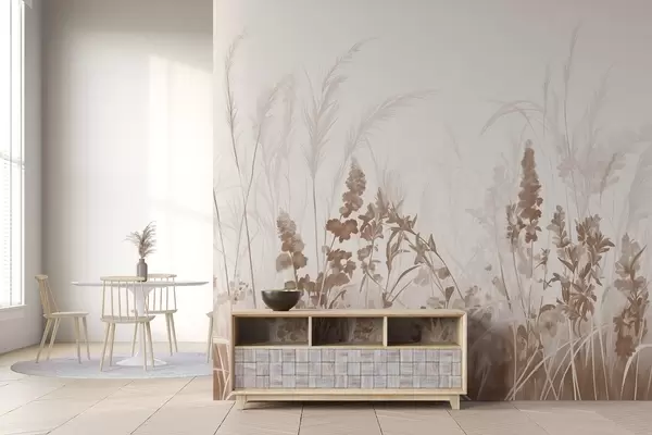 Fotobehang Bruine bloemen en beige riet in een veld, minimalistisch schilderij textuur, lichte achtergrond, zachte kleuren, fijne penseelstreken N° w08982v1