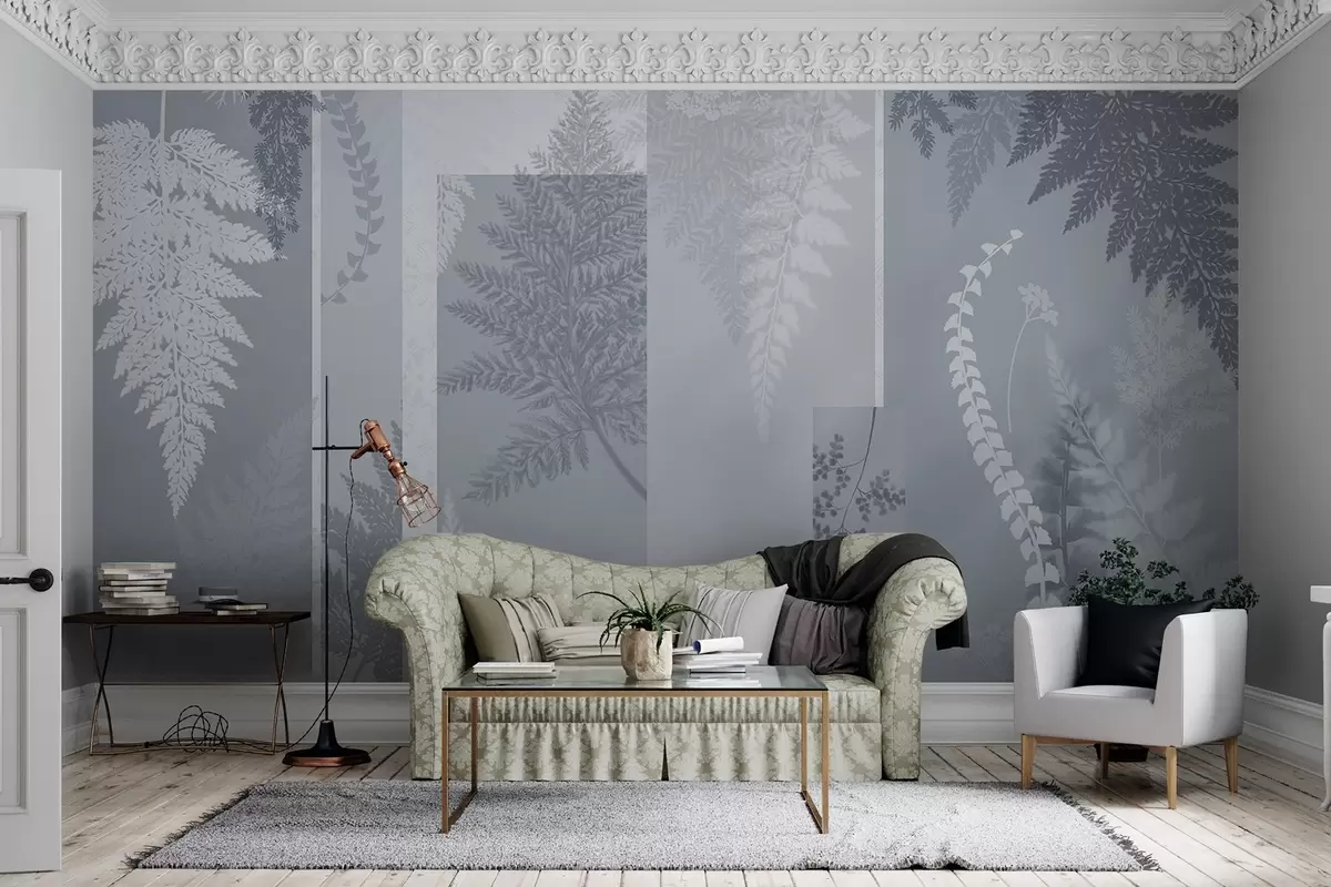 Fotobehang Varensbladeren in blauw en wit, gerangschikt in verticale strepen, waardoor een botanische en minimalistische print ontstaat, zachte en gedempte kleuren N° w09007v1