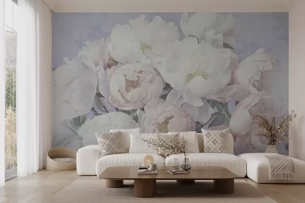 Fotobehang Gestructureerde abstracte perzik en witte pioenrozen met groene bladeren, lichte achtergrond, zachte en delicate kleuren, vintage stijl w09008v1