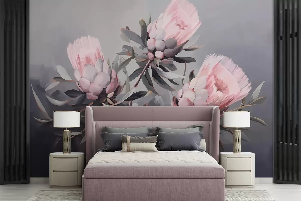 Fotobehang Roze protea abstracte bloemen met grijze bladeren, zachte textuur penseelstreken, gedempte kleuren, tegen een onscherpe grijze achtergrond N° w09014