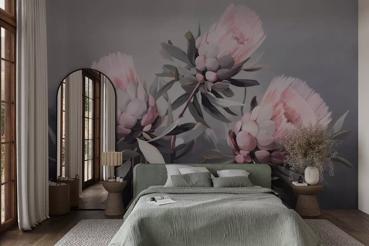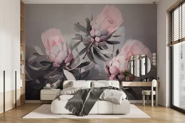 Fotobehang Roze protea abstracte bloemen met grijze bladeren, zachte textuur penseelstreken, gedempte kleuren, tegen een onscherpe grijze achtergrond N° w09014
