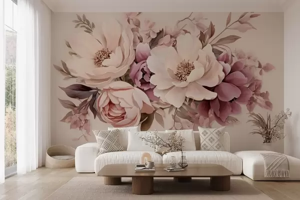 Fotobehang Delicate compositie van roze en beige bloemen, pioenen met bladeren N° w09019