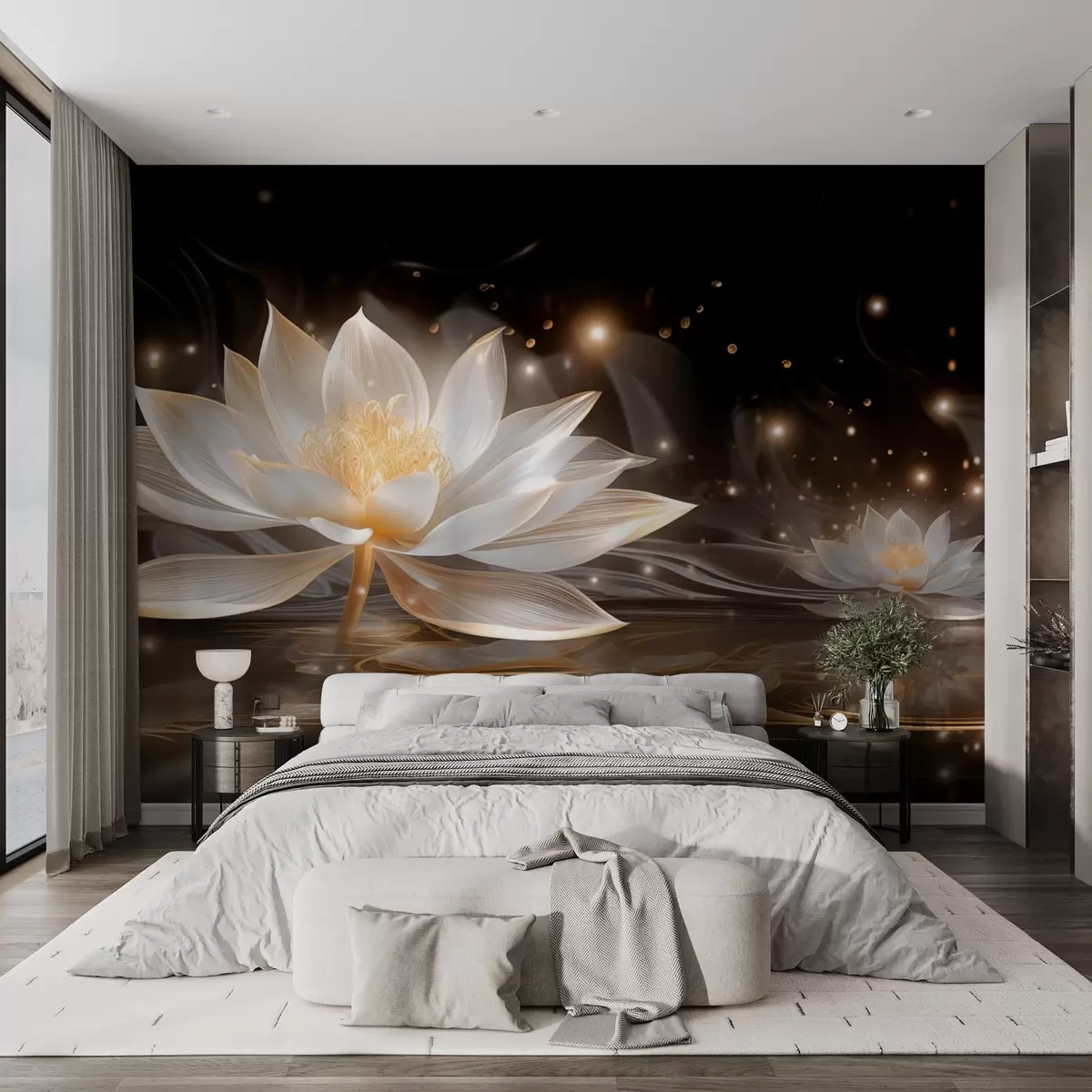 Fotobehang Elegante witte waterlelies op donker water N° w09021