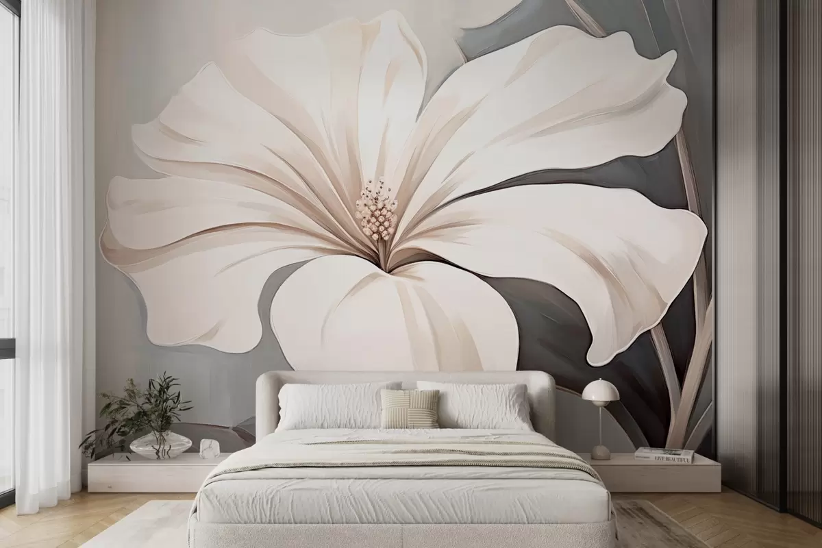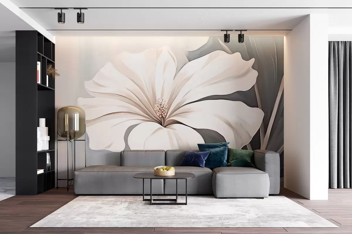 Fotobehang Grote witte bloem met bloemblaadjes op een blauwgrijze achtergrond N° w09033