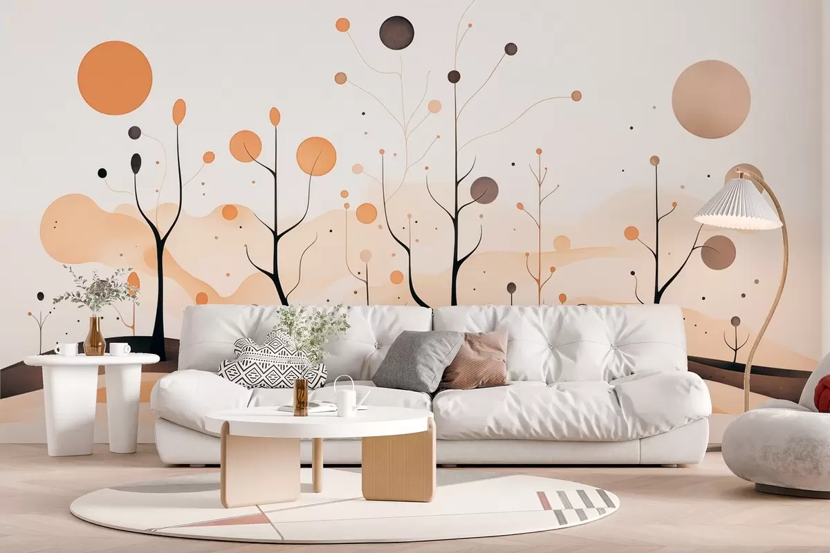 Fotobehang Abstracte bomen met bollen en zon in beige-grijze tinten N° w09043