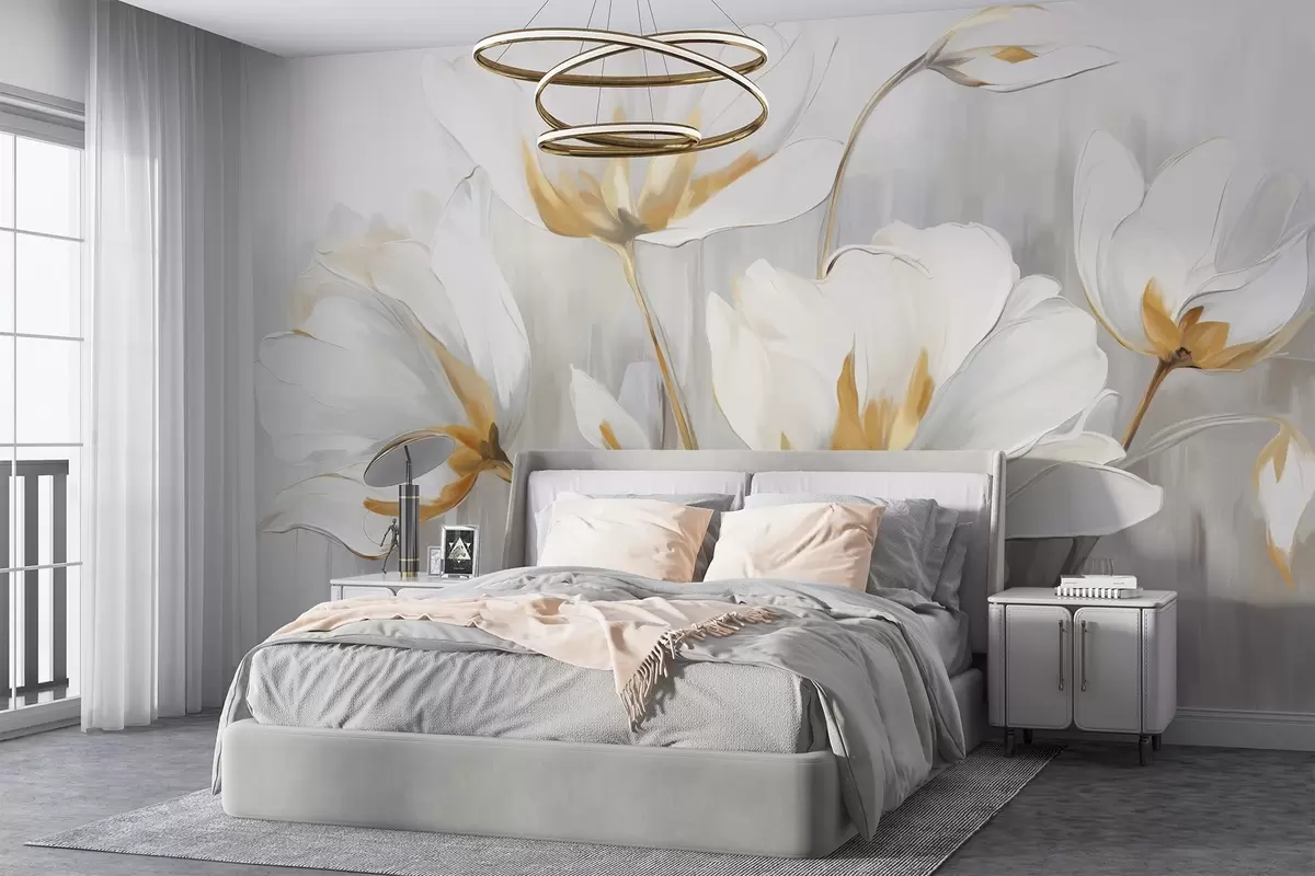Fotobehang Witte abstracte bloemen met witte bloemblaadjes en stengels op een grijze achtergrond met grijze en witte verticale penseelstreken N° w09047