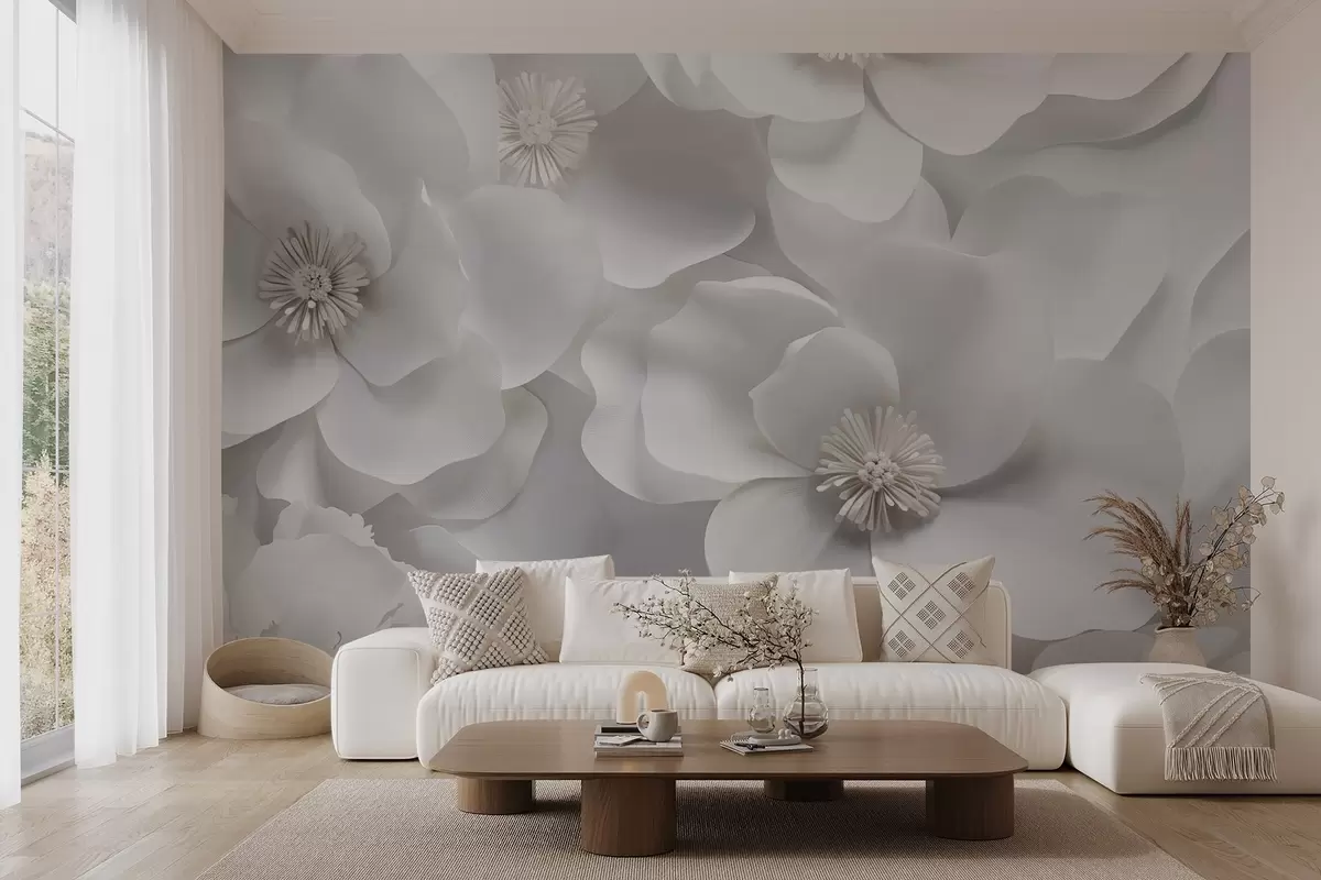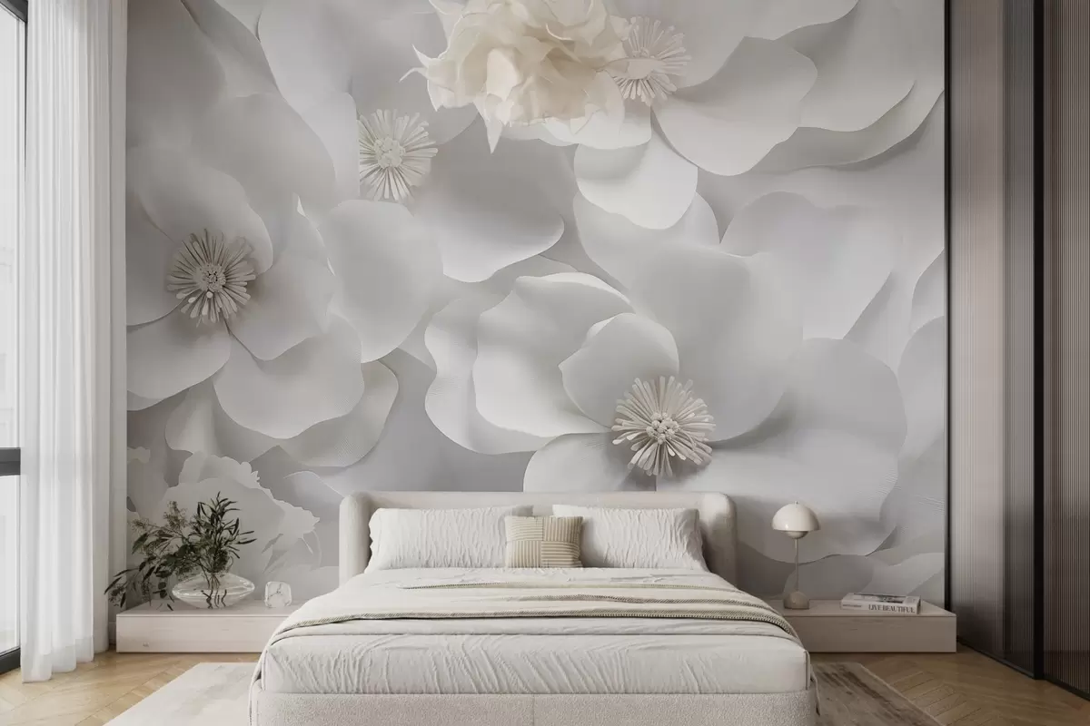 Fotobehang Witte bloemen met delicate bloemblaadjes, gerangschikt in een dicht cluster, creëren een gevoel van zuiverheid en elegantie op een witte achtergrond N° w09053