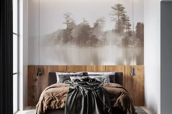 Fotobehang Abstract minimalistisch textuurlandschap met een meer en bomen die weerspiegelen in het water in beige en witte tinten N° w09058v1