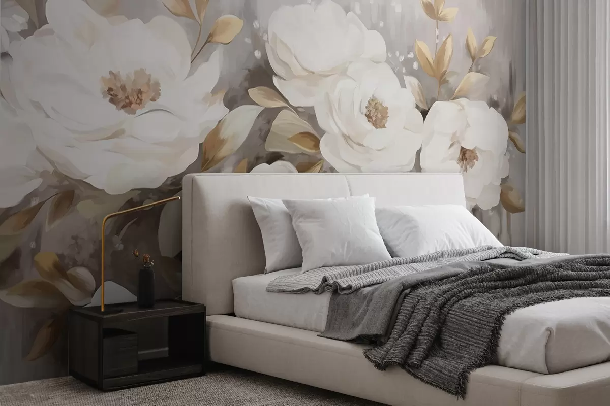 Fotobehang Witte bloemen met gele bladeren, zachte bloemblaadjes, delicaat bloemstuk, neutraal kleurenpalet, gestructureerde penseelstreken N° w09062