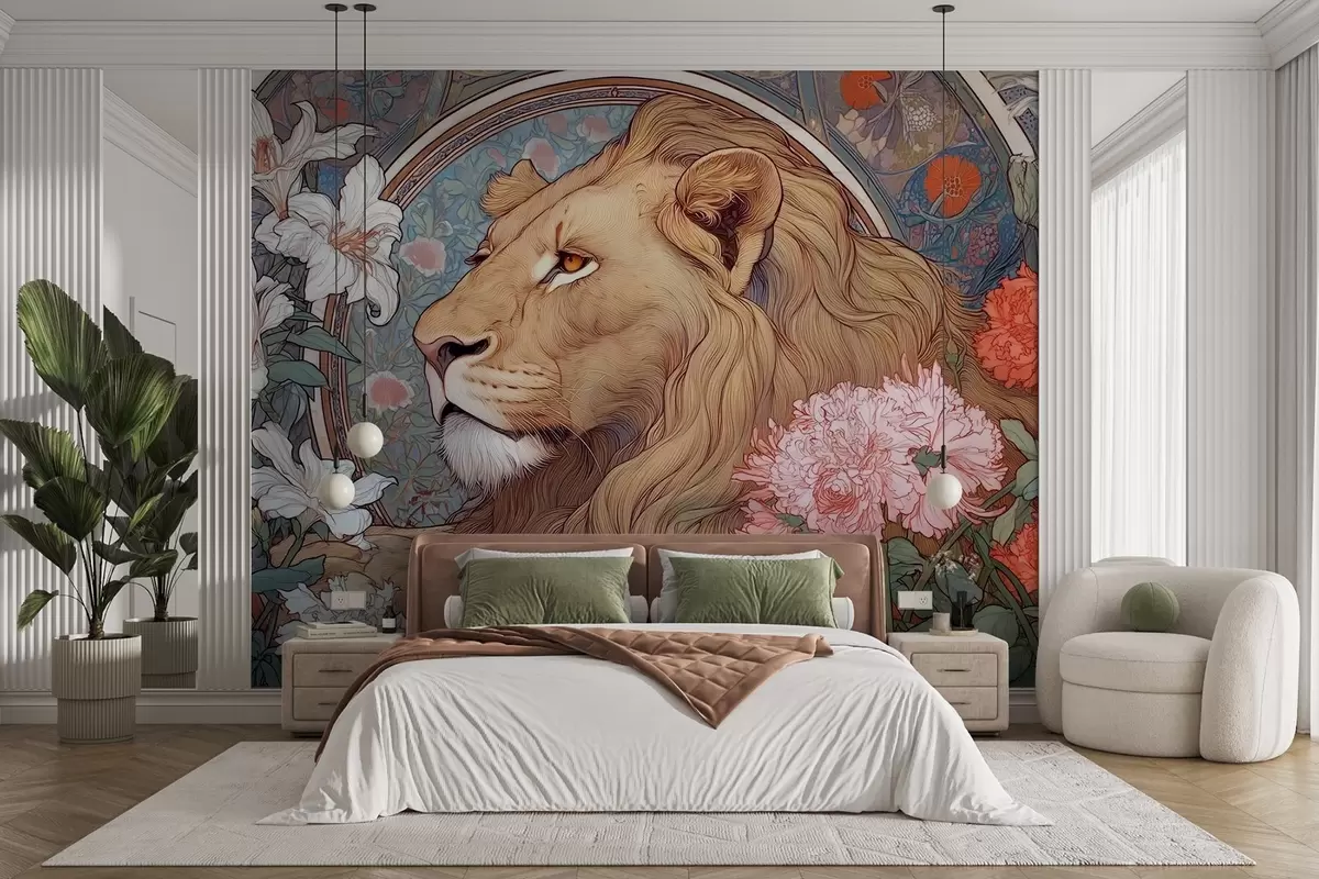 Fotobehang Een leeuw omringd door vele bloemen in de stijl van Alphonse Mucha N° w09073