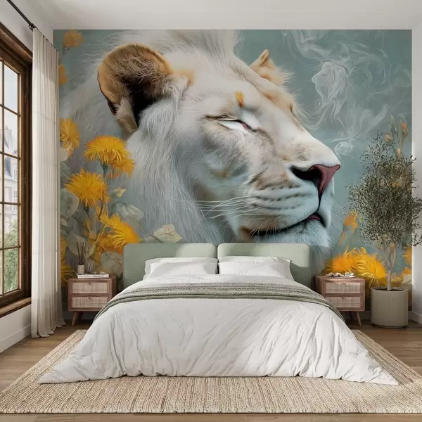 Fotobehang Een witte leeuw omringd door gele bloemen en rook N° w09080