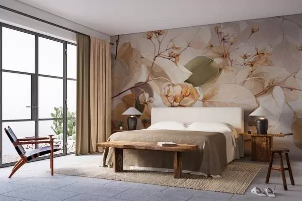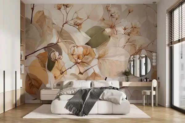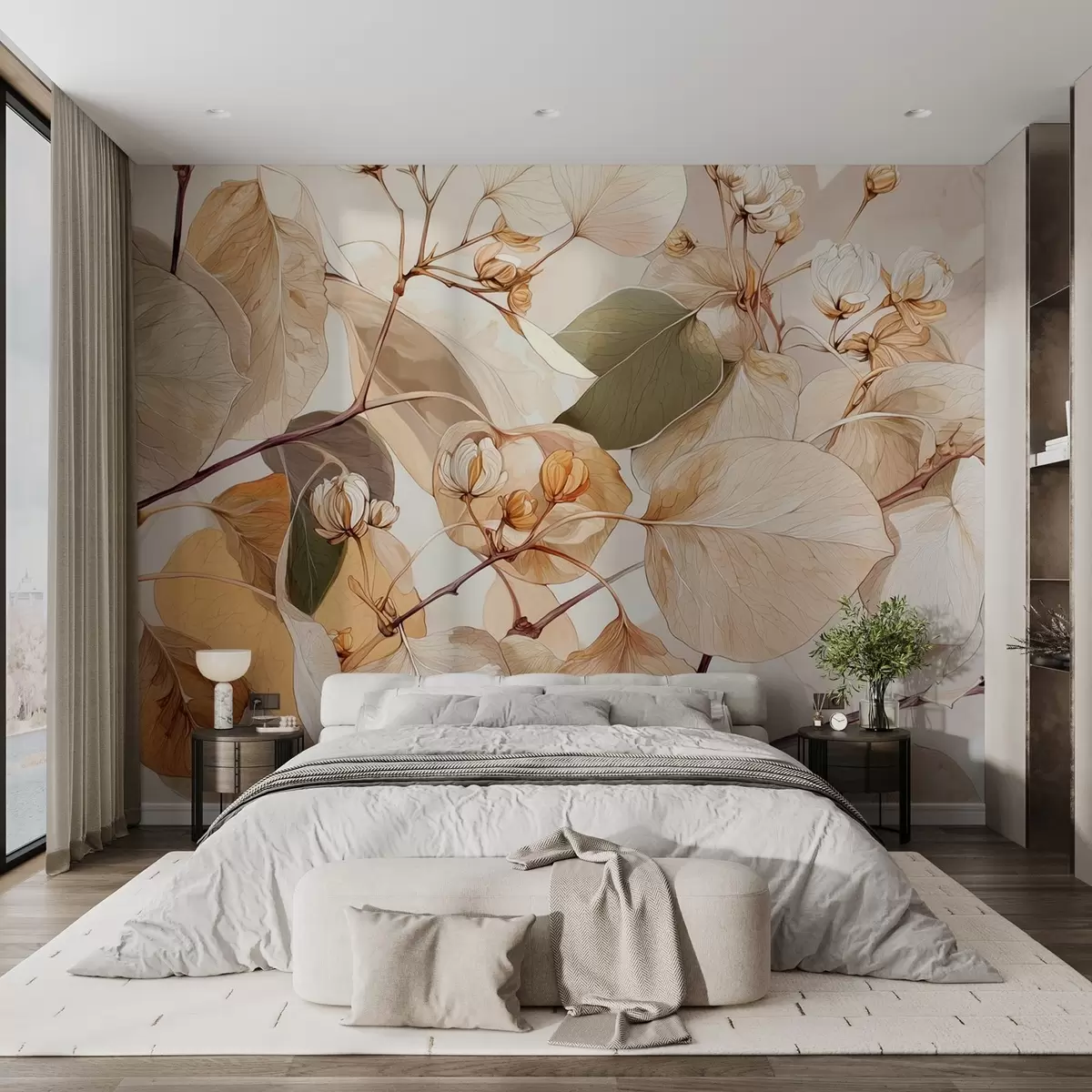 Fotobehang Takken van espenbladeren en bloemen in olieverfschilderijstijl in beige tinten N° w09082