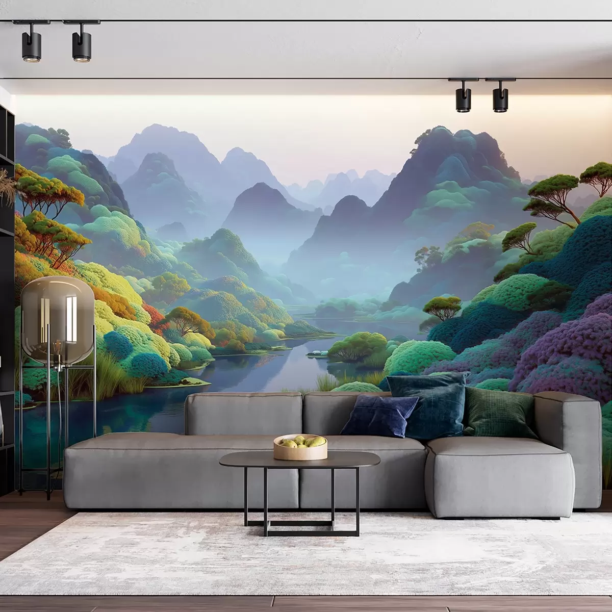 Fotobehang Berglandschap met een rivier in blauwe tinten met bomen en struiken N° w09088
