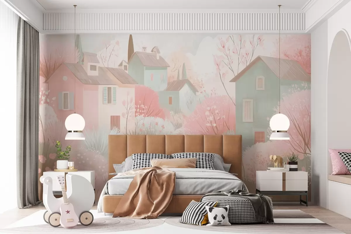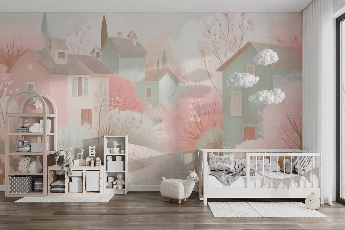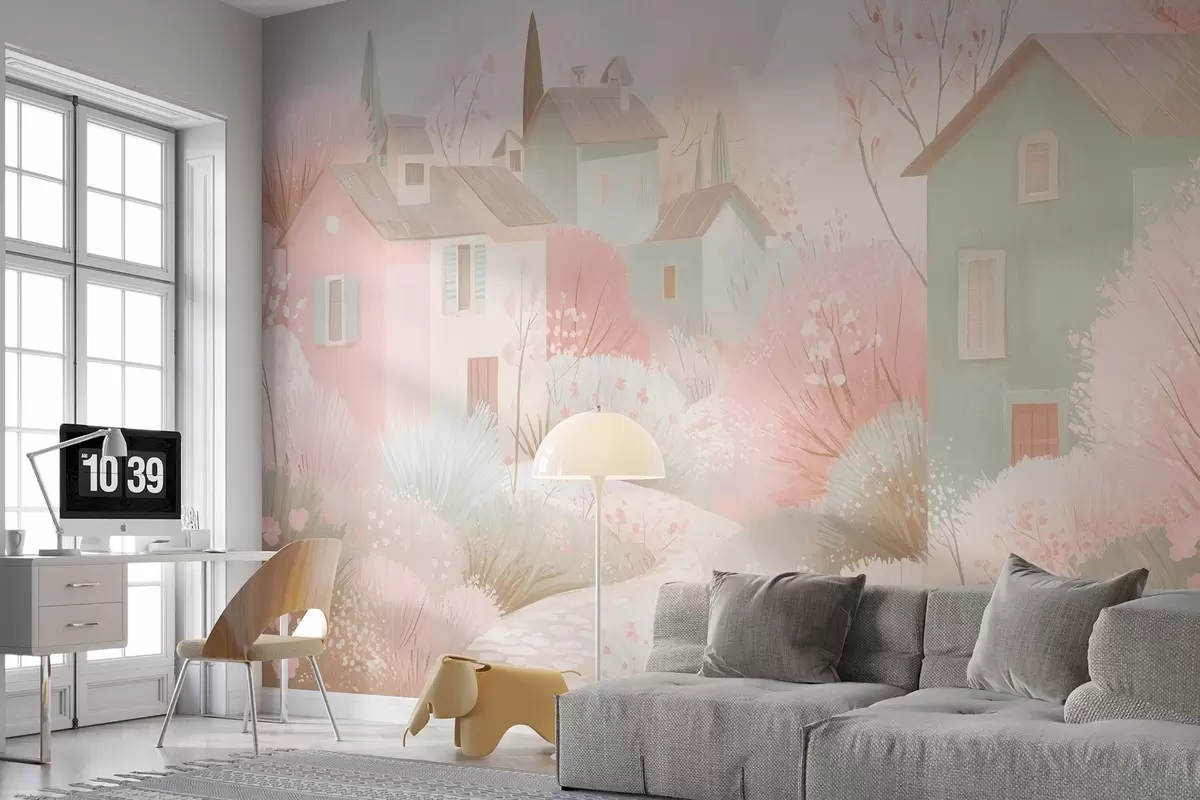 Fotobehang Sprookjesachtige stad in olieverfstijl in roze tinten N° w09095