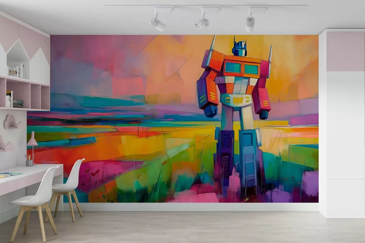 Fotobehang Robot tegen een helder abstract landschap in olieverfstijl N° w09096