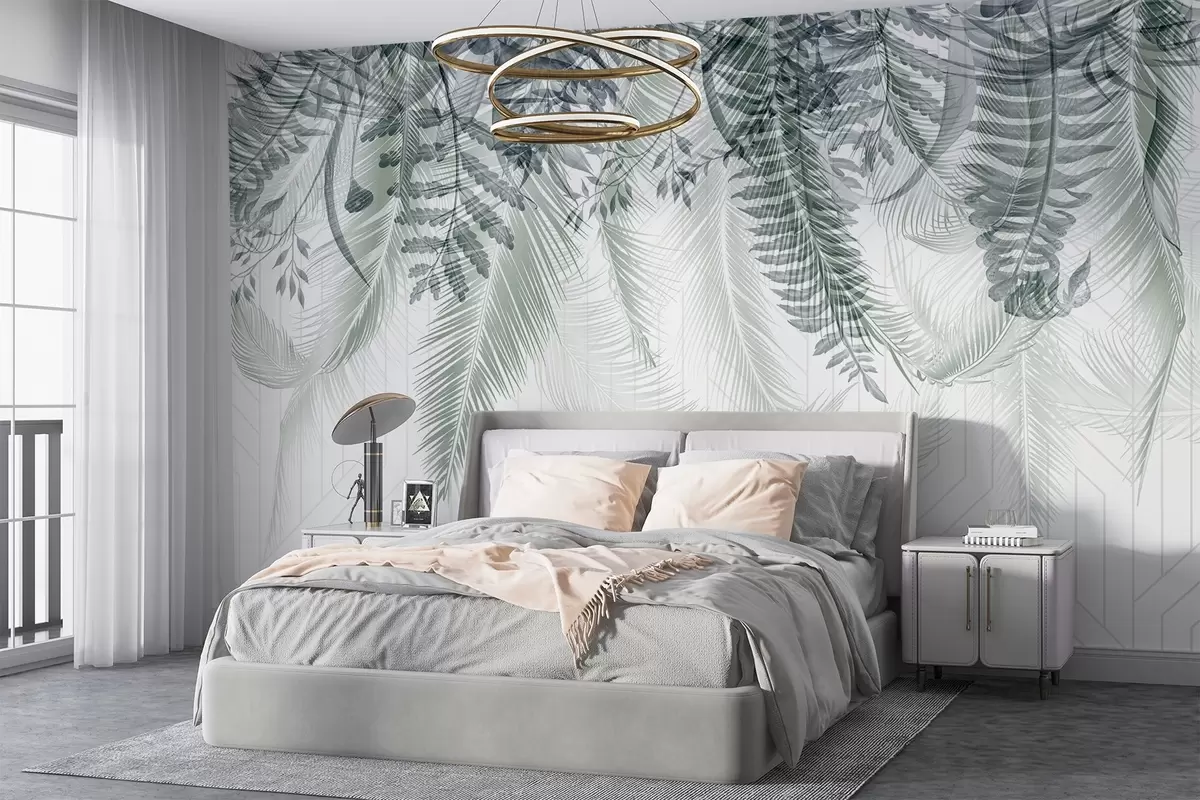 Fotobehang Gevoelige vallende tropische varen en palmbladeren, geometrische achtergrond, zacht licht, gedempte kleuren, elegant N° w09106