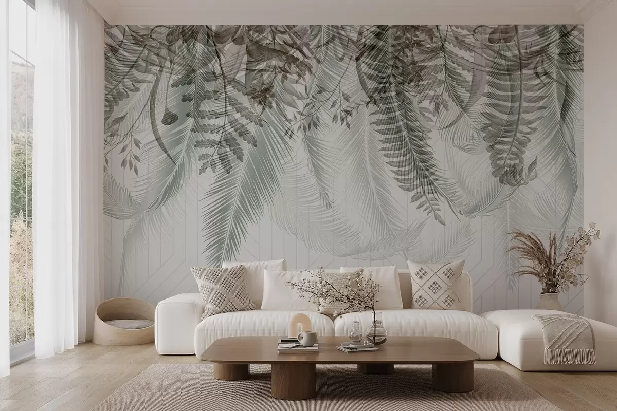 Fotobehang Gevoelige vallende tropische varen en palmbladeren, geometrische achtergrond, zacht licht, gedempte kleuren, elegant N° w09106v1