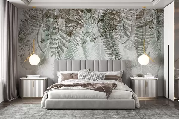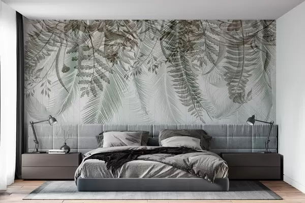 Fotobehang Gevoelige vallende tropische varen en palmbladeren, geometrische achtergrond, zacht licht, gedempte kleuren, elegant N° w09106v1