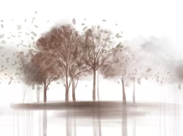 Fotobehang Abstract landschap met bomen met groene bladeren die weerspiegelen in het water, in aquarel structuurstijl N° w09109