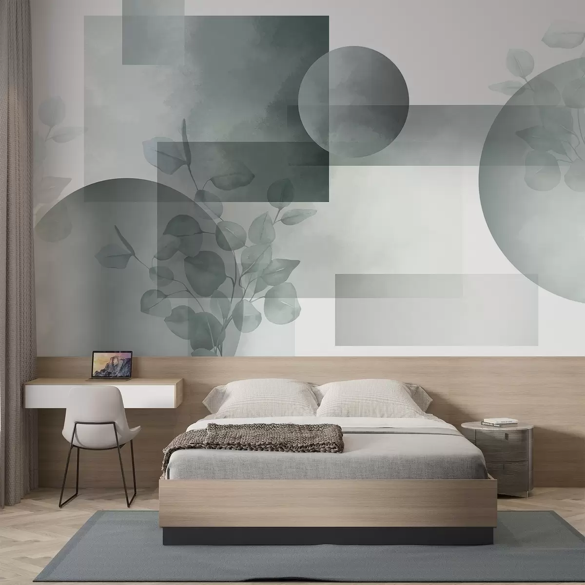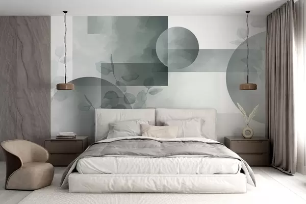 Fotobehang Abstract modern minimalistisch geometrisch ontwerp met cirkels en rechthoeken, eucalyptusbladeren, aquareleffect N° w09110
