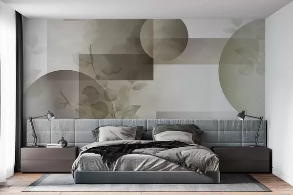 Fotobehang Abstract modern minimalistisch geometrisch ontwerp met cirkels en rechthoeken, eucalyptusbladeren, aquareleffect N° w09110v1