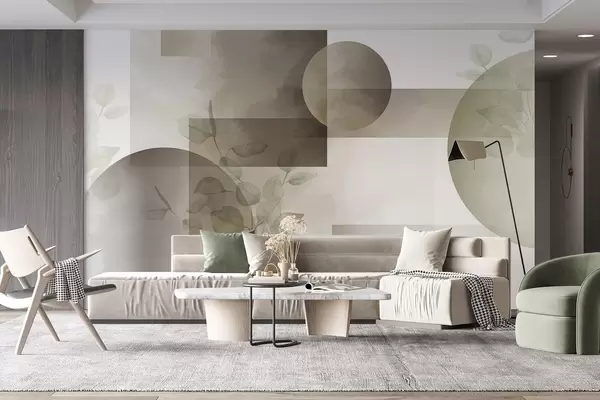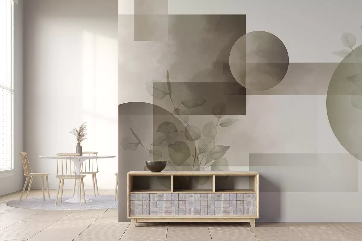 Fotobehang Abstract modern minimalistisch geometrisch ontwerp met cirkels en rechthoeken, eucalyptusbladeren, aquareleffect N° w09110v1