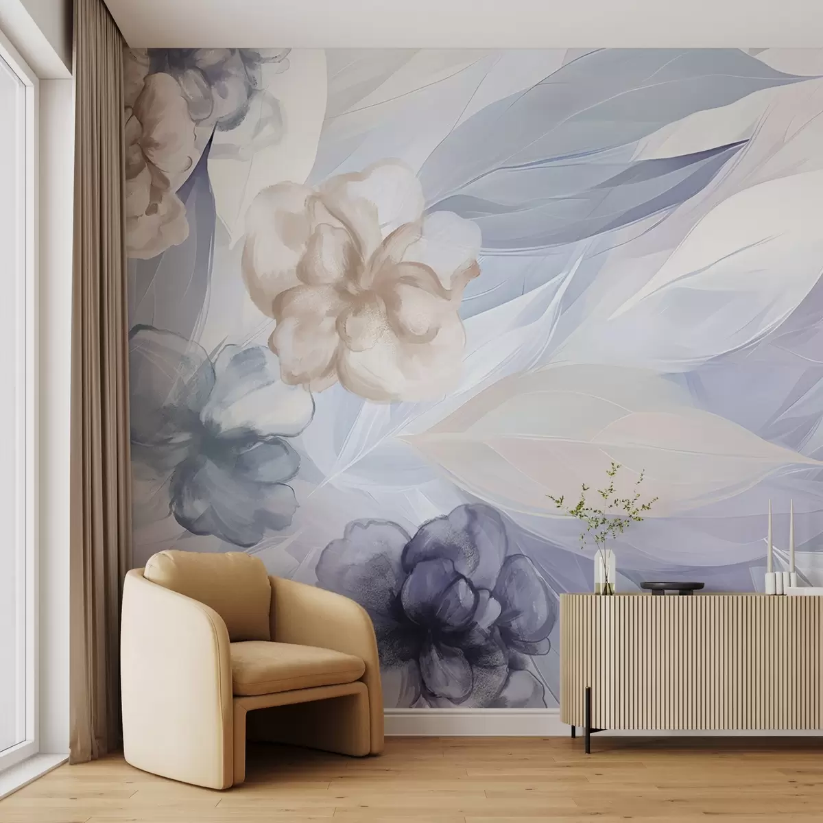 Fotobehang Delicate bloemen en bladeren in tinten wit, blauw, paars en beige bloemenachtergrond , zachte kleuren, delicate bloemblaadjes N° w09111