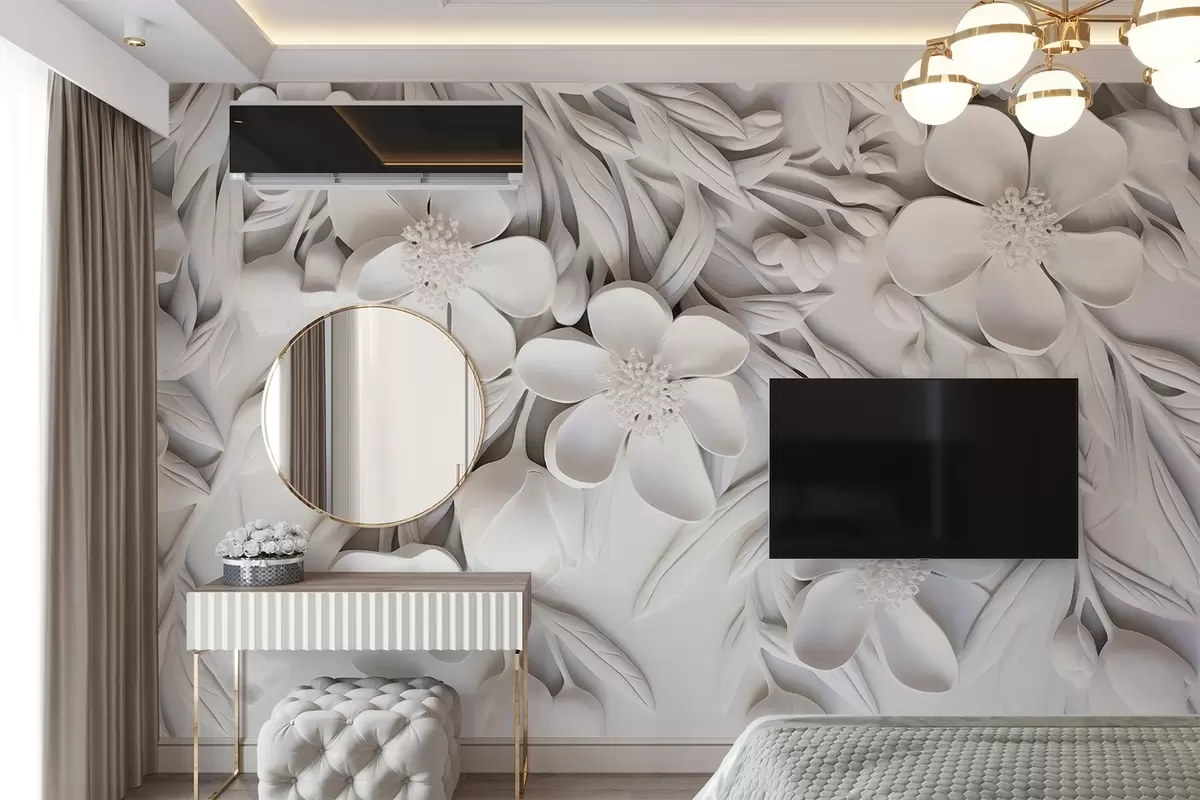 Fotobehang Witte bloemen en bladeren op een witte achtergrond, bloemen elegant, decoratief ontwerp, ingewikkelde details N° w09113