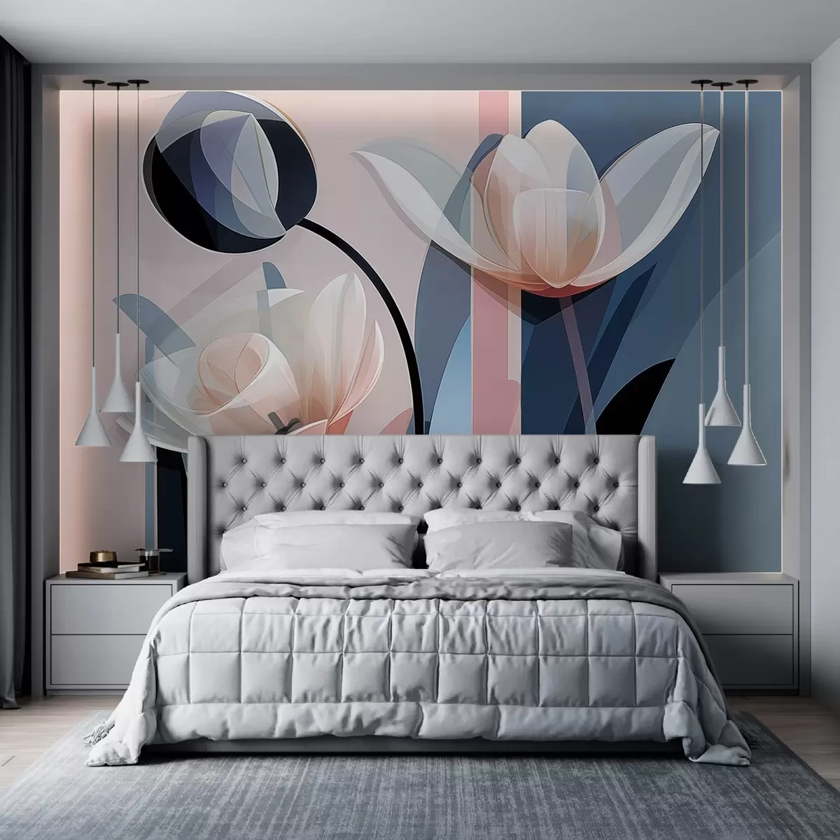 Fotobehang Abstract modern ontwerp met tulpen met transparante bloemblaadjes in pasteltinten roze, wit en donkerblauw N° w09116