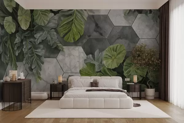 Fotobehang Groene tropische bladeren en planten op een achtergrond van grijze en witte structuurtegels, weelderig gebladerte modern ontwerp N° w09117