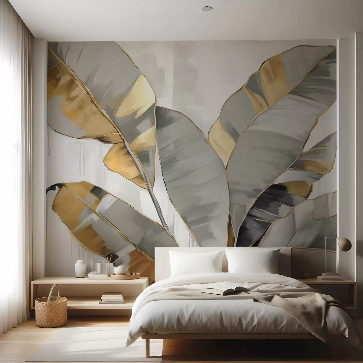 Fotobehang Banaan tropische getextureerde bladeren met grijze en gele tinten, moderne stijl, neutrale achtergrond, decoratief schilderij N° w09118