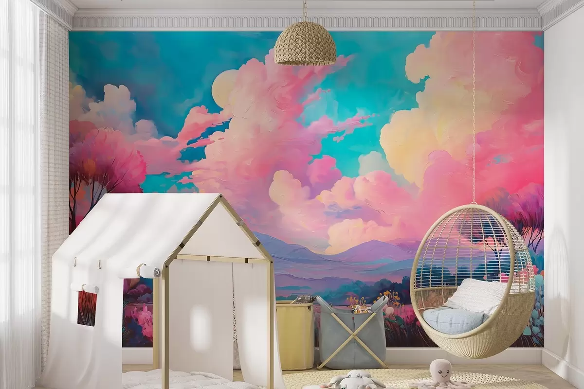 Fotobehang Kleurrijk landschap in olieverfstijl met een roze lucht, planten en bomen N° w09123