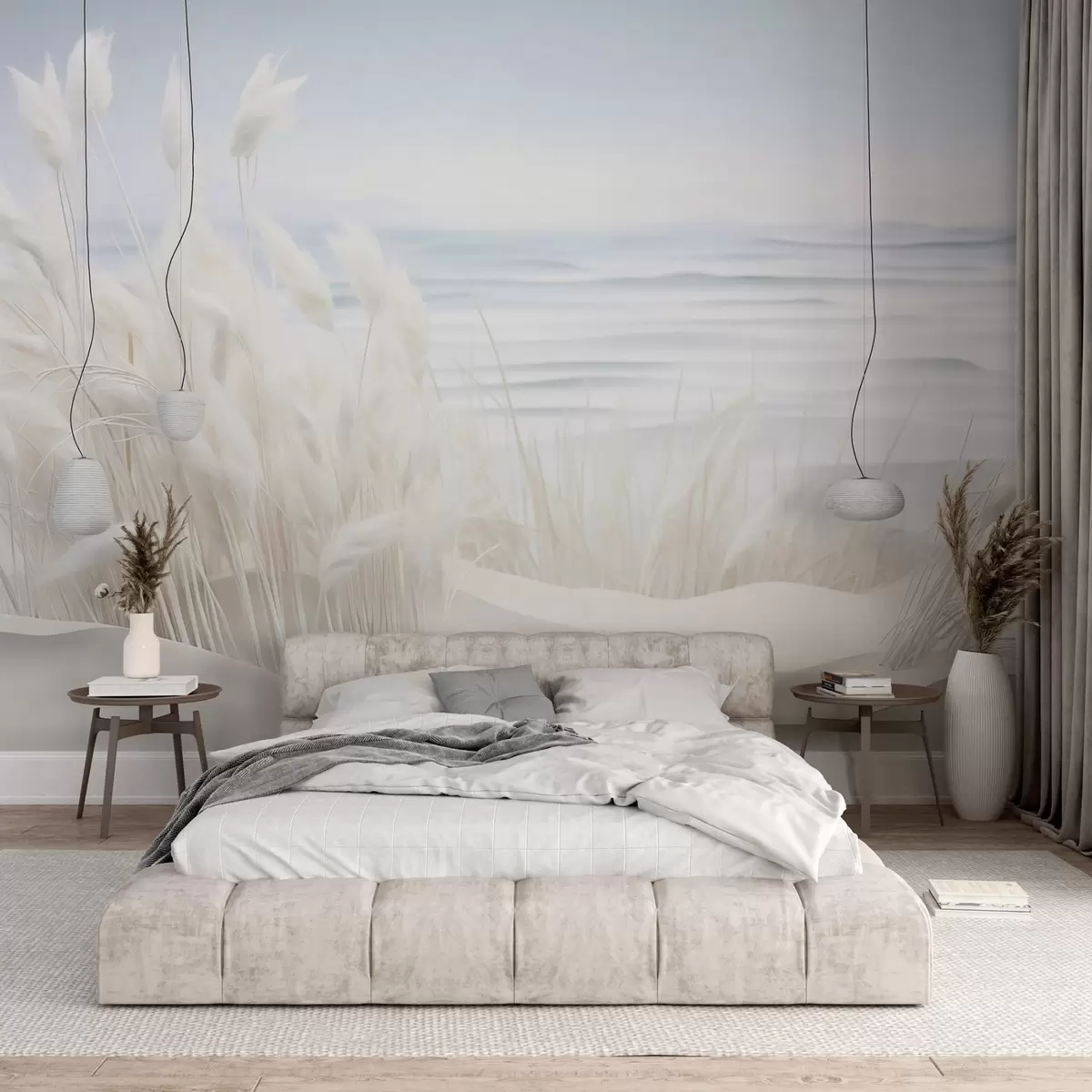 Fotobehang Landschap met wit pampagras op een zandduin, met een lichtblauwe oceaan op de achtergrond, zachte, minimalistische stijl N° w09132
