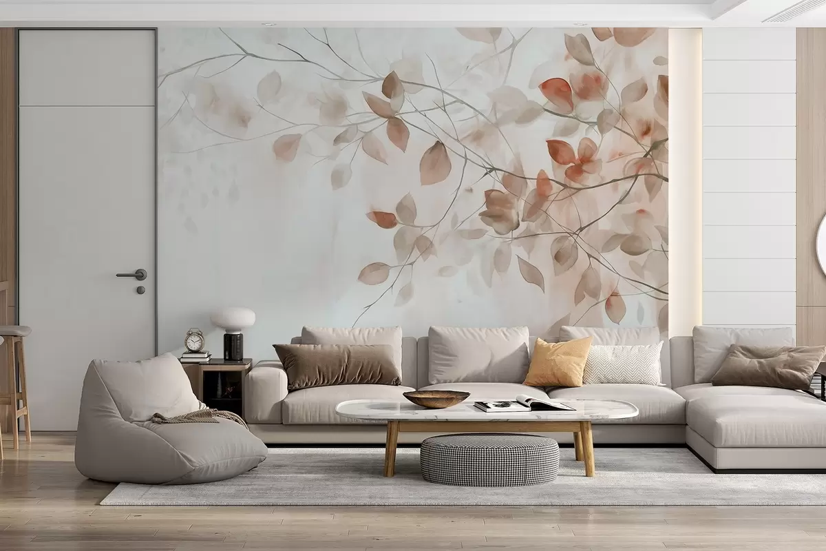 Fotobehang Texturaal aquarelschilderij imitatie van bruine bladeren en takken, zachte kleuren, delicate details tegen een witte achtergrond N° w09133