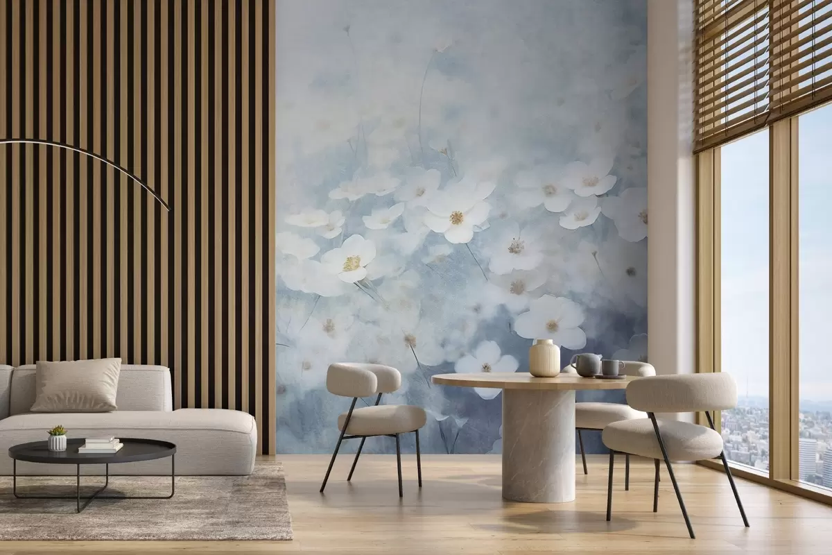 Fotobehang Textuurveld van witte anemoonbloemen, zachte focus, dromerige sfeer, lichtblauw en wit kleurenpalet, lenteweide N° w09134
