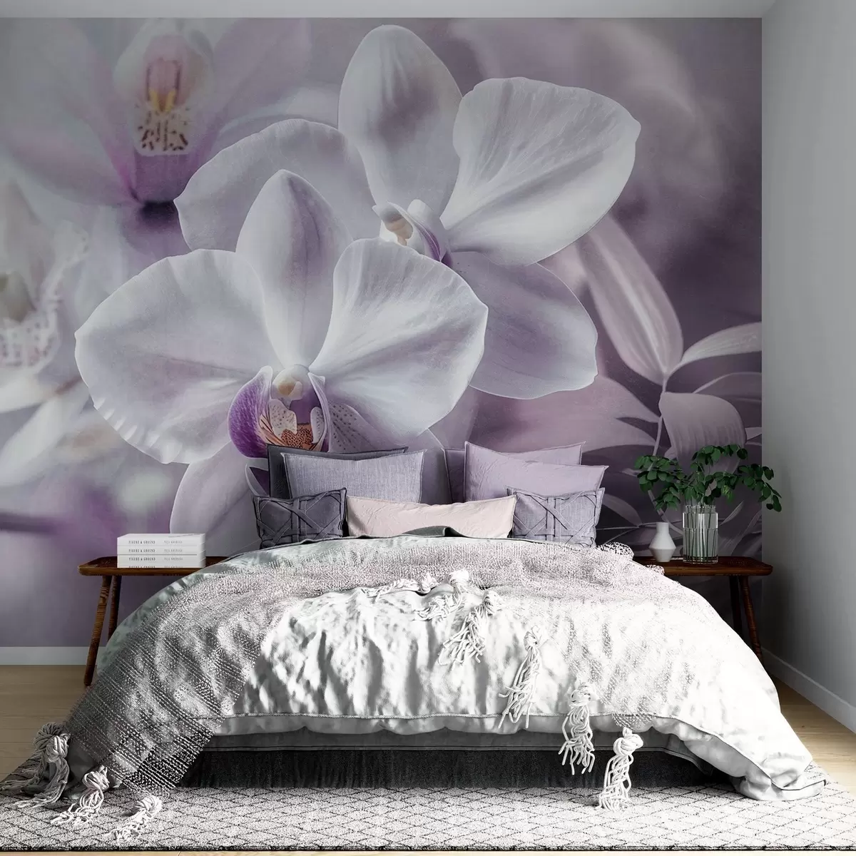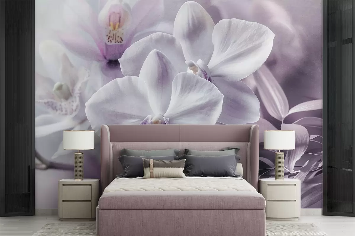 Fotobehang Witte en lila delicate orchideeënbloemen, zachte verlichting en een wazige getextureerde achtergrond N° w09155