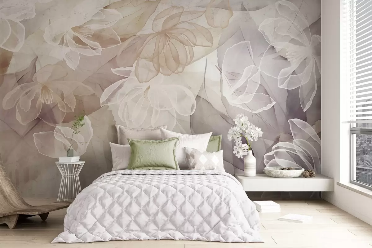 Fotobehang Bloemen en bladeren met transparante bloemblaadjes in tinten wit, beige en paars, zacht en delicaat N° w09158