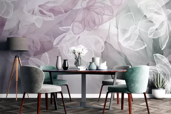 Fotobehang Bloemen en bladeren met transparante bloemblaadjes in tinten wit, roze en groen, zacht en delicaat N° w09158v1