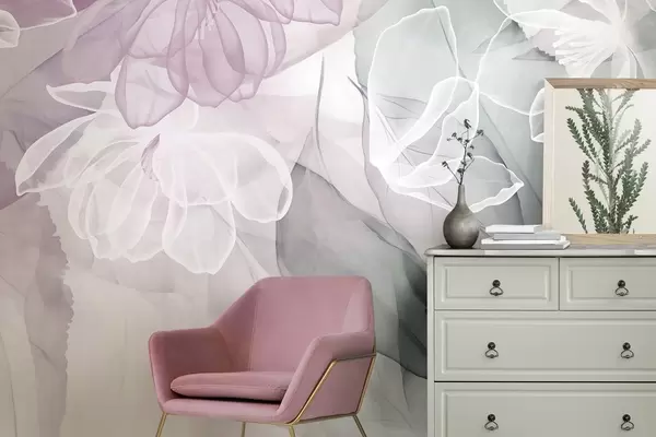 Fotobehang Bloemen en bladeren met transparante bloemblaadjes in tinten wit, roze en groen, zacht en delicaat N° w09158v1