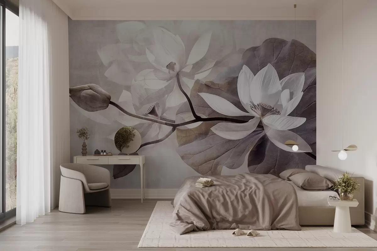 Fotobehang Korrelige textuur van delicate lotusbloemen met bladeren en stengels in een zacht beige kleurenpalet N° w09159