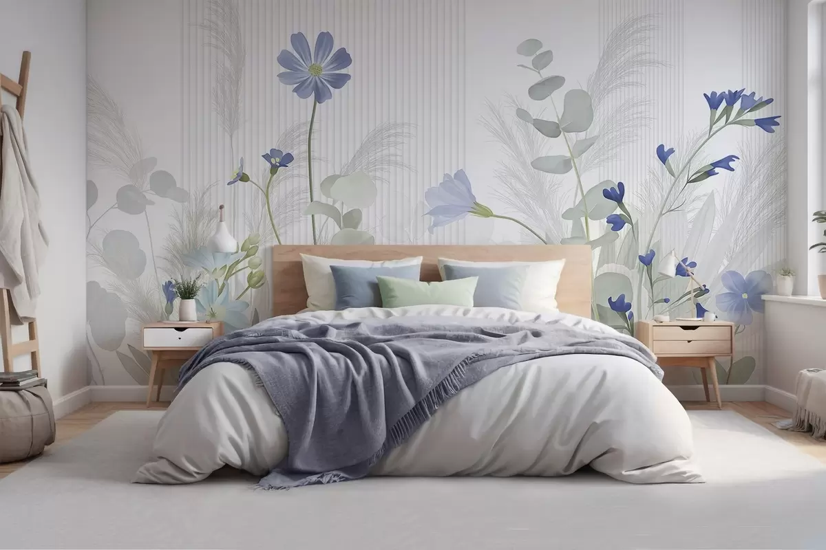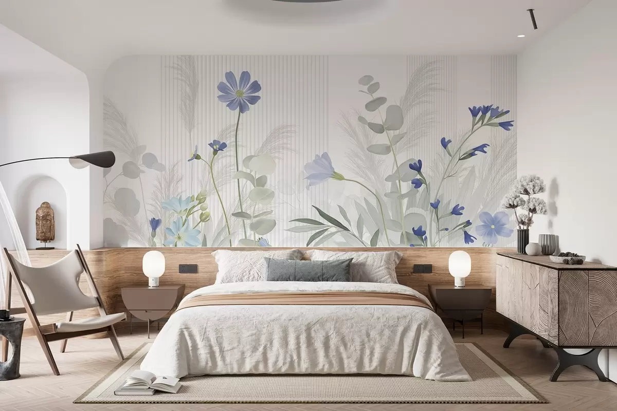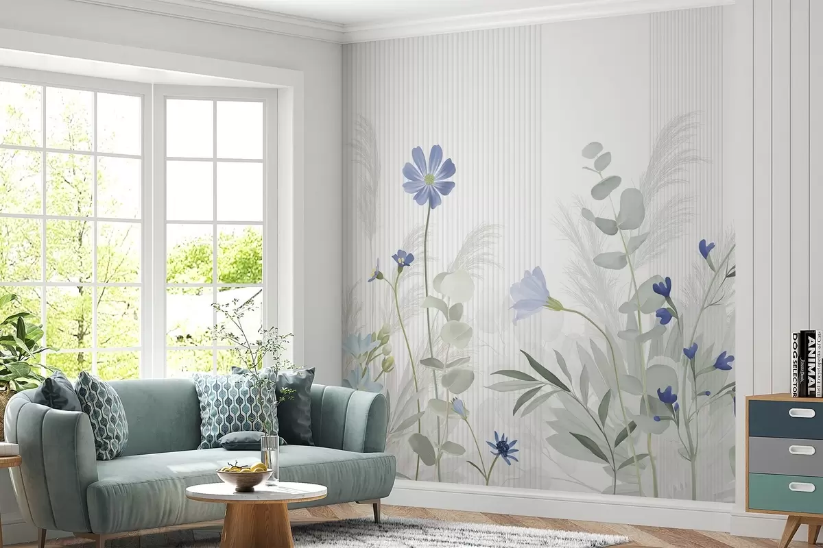 Fotobehang Bloemen in pastelkleuren, lichtgroene bladeren, witte achtergrond met verticale lijnen, elegant en minimalistisch N° w09161v1