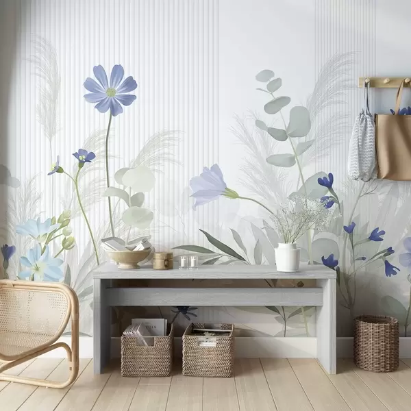 Fotobehang Bloemen in pastelkleuren, lichtgroene bladeren, witte achtergrond met verticale lijnen, elegant en minimalistisch N° w09161v1