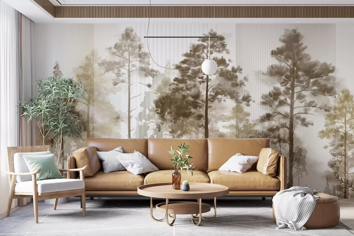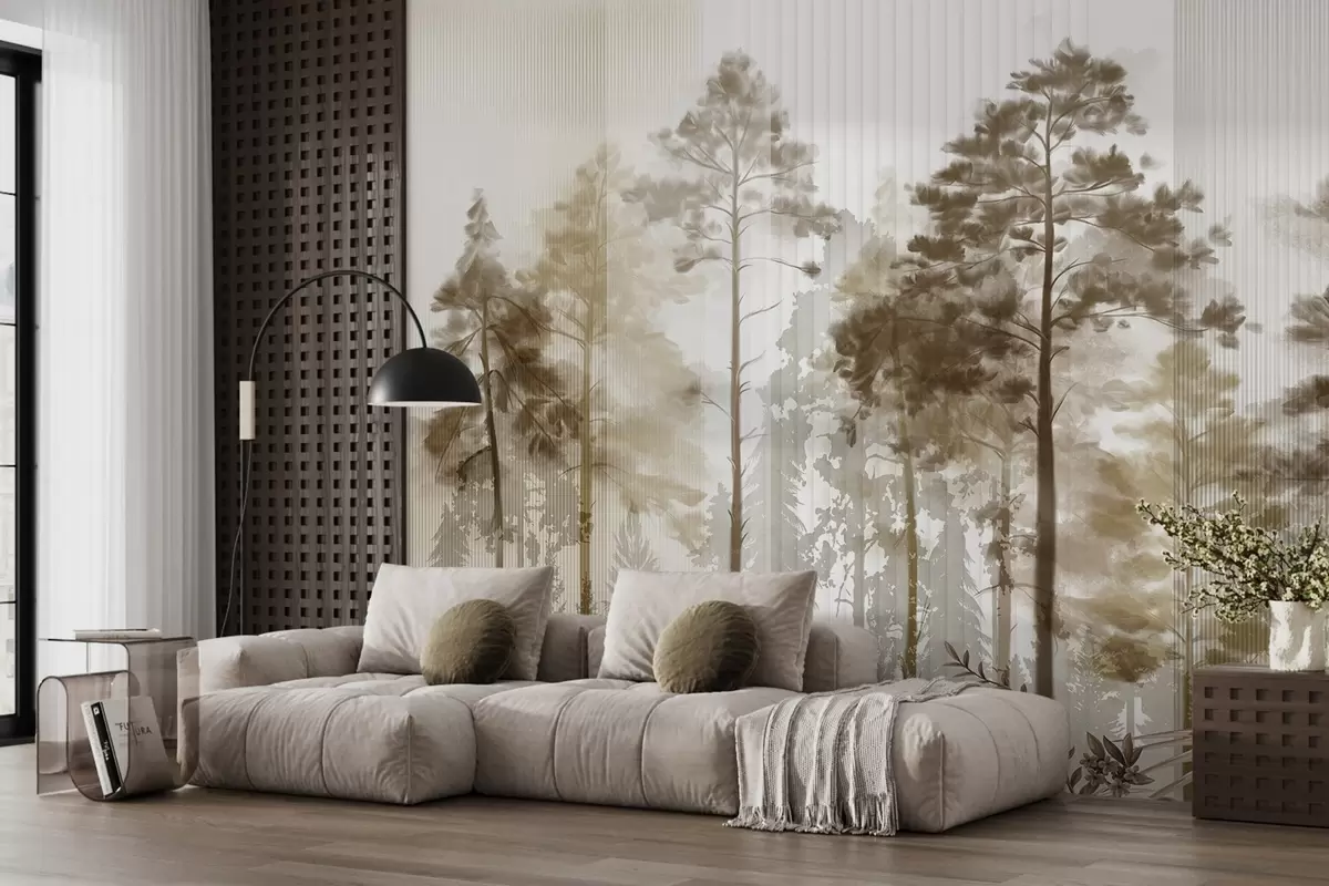 Fotobehang Een dicht bos met hoge dennenbomen, weelderig beige gebladerte, een mistige sfeer met verticale lijntexturen N° w09163v1