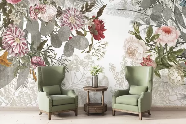 Fotobehang Vintage bloemstuk met rozen, eucalyptus en mimosa in zachte groene, rode en roze tinten N° w09164v1